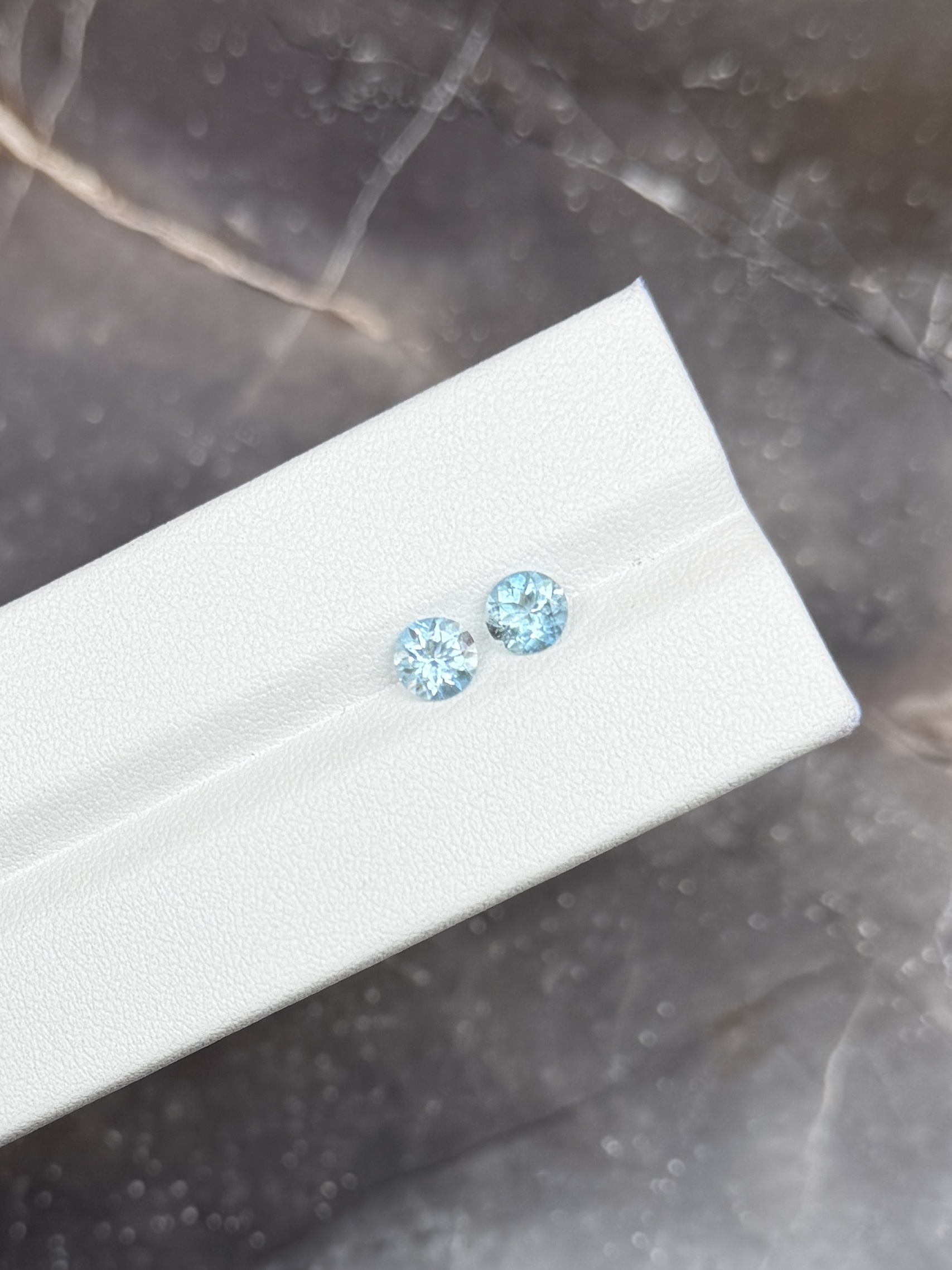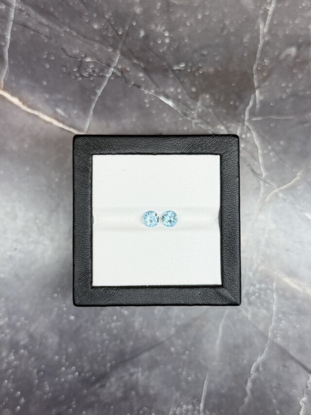 Пара нигерийских аквамаринов в огранке круг. Аквамарин — это зеленовато-голубая, голубая или голубовато-зеленая разновидность минерала берилл. Цвет и прозрачность аквамарина — основные влияющие на стоимость характеристики. Самыми дорогими считаются насыщенные голубые и серовато-голубые камни. Зеленоватые образцы ценятся меньше. Интенсивность цвета зависит от количества железа в составе. По чистоте ценятся больше всего прозрачные, свободные от включений камни. Посмотреть пару вживую можно в нашем шоу-руме, предварительно записавшись через форму обратной связи.