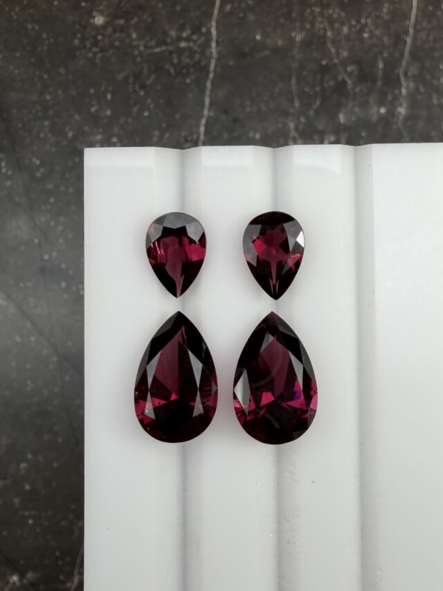 Гранат родолит в огранке груша. Размер: нижняя пара — 14х9 мм, верхняя — 10.7 мм. общий вес сета: 14.26 карат
