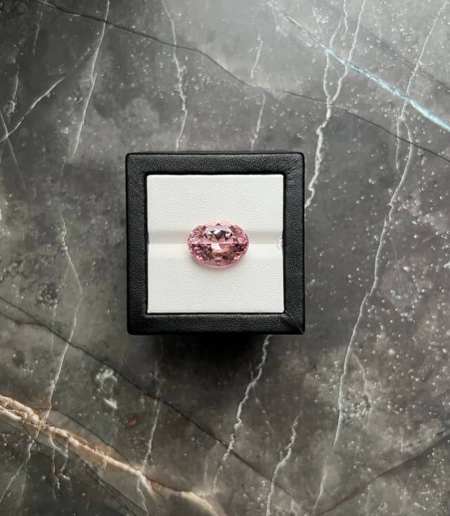 Розовый морганит с весом 14.4 карат в огранке овал. Все фотографии выполнены при естественном освещении.