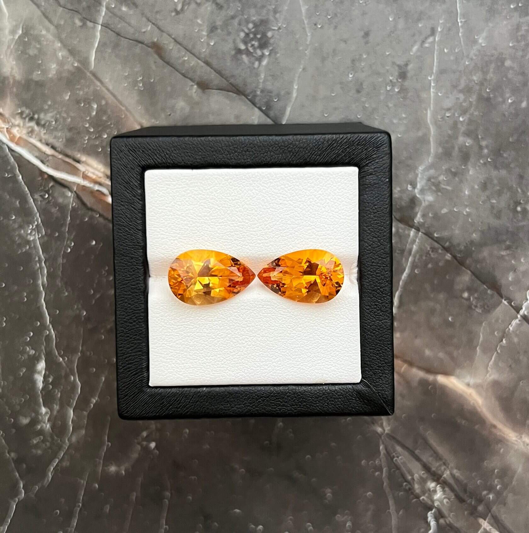 Пара бразильских цитринов в огранке груша с весом 14.19 карат. Цитрин — прозрачная разновидность кварца от бледно-желтого до коричневато-оранжевого цвета. Его окраска связана с примесью железа в составе камня. Натуральный цитрин встречается редко. Его природный оттенок — бледно-желтый. Большая часть ярких цитринов, представленных на рынке, является результатом термической обработки аметиста или дымчатого кварца. Окраска цитрина, а также его доступность и долговечность, делают этот камень популярным и востребованным у покупателей. Это привлекательная альтернатива жёлтому топазу и желтому сапфиру. Посмотреть камень вживую можно в нашем шоу-руме, предварительно записавшись через форму обратной связи. Также у нас в наличии сырьё бразильского цитрина. Если вы не нашли подходящий вам камень из готового ассортимента, обращайтесь к нам за услугой огранки под заказ. Мы поможем вам выбрать оттенок, определиться с размером, формой и типом огранки и приступим к выполнению заказа. Вы получите камень с правильными пропорциями и хорошей полировкой.