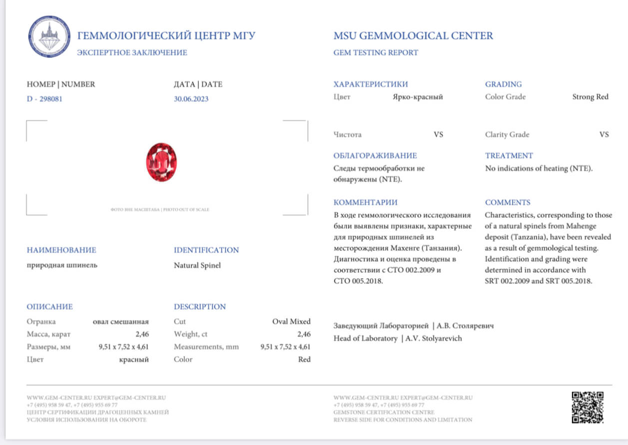 Ярко-красная шпинель Махенге весом 2.46 карат в огранке овал. Шпинель — это целая группа минералов со схожей кристаллической структурой. В ювелирном деле используется так называемая благородная шпинель. Она встречается в широкой гамме оттенков и обладает превосходным субадамантиновым блеском. Шпинель — достаточно твердый минерал для использования в повседневных украшениях. Твердость шпинели по шкале Мооса 7.5-8. Красная и насыщенная розовая шпинель — в числе самых редких и дорогих оттенков. Основные регионы, из которых поступает благородная красная и розовая шпинель — Памир, граница Афганистана и Пакистана; Мьянма (Бирма) и Танзания. Танзанийская шпинель Махенге была обнаружена в конце 1980х гг. и к началу 2000х годов интерес к камню многократно возрос. Цветовая палитра шпинели из этого региона разнообразна, но классическим цветом считается насыщенная розовато-красная высокой степени насыщенности. Месторождение постепенно истощается, и цены на шпинель Махенге продолжают стремительно расти. Благодаря примеси хрома в шпинели Махенге, она ярко люминесцирует под воздействием УФ-лучей. Посмотреть камень вживую можно в нашем шоу-руме, предварительно записавшись через форму обратной связи.