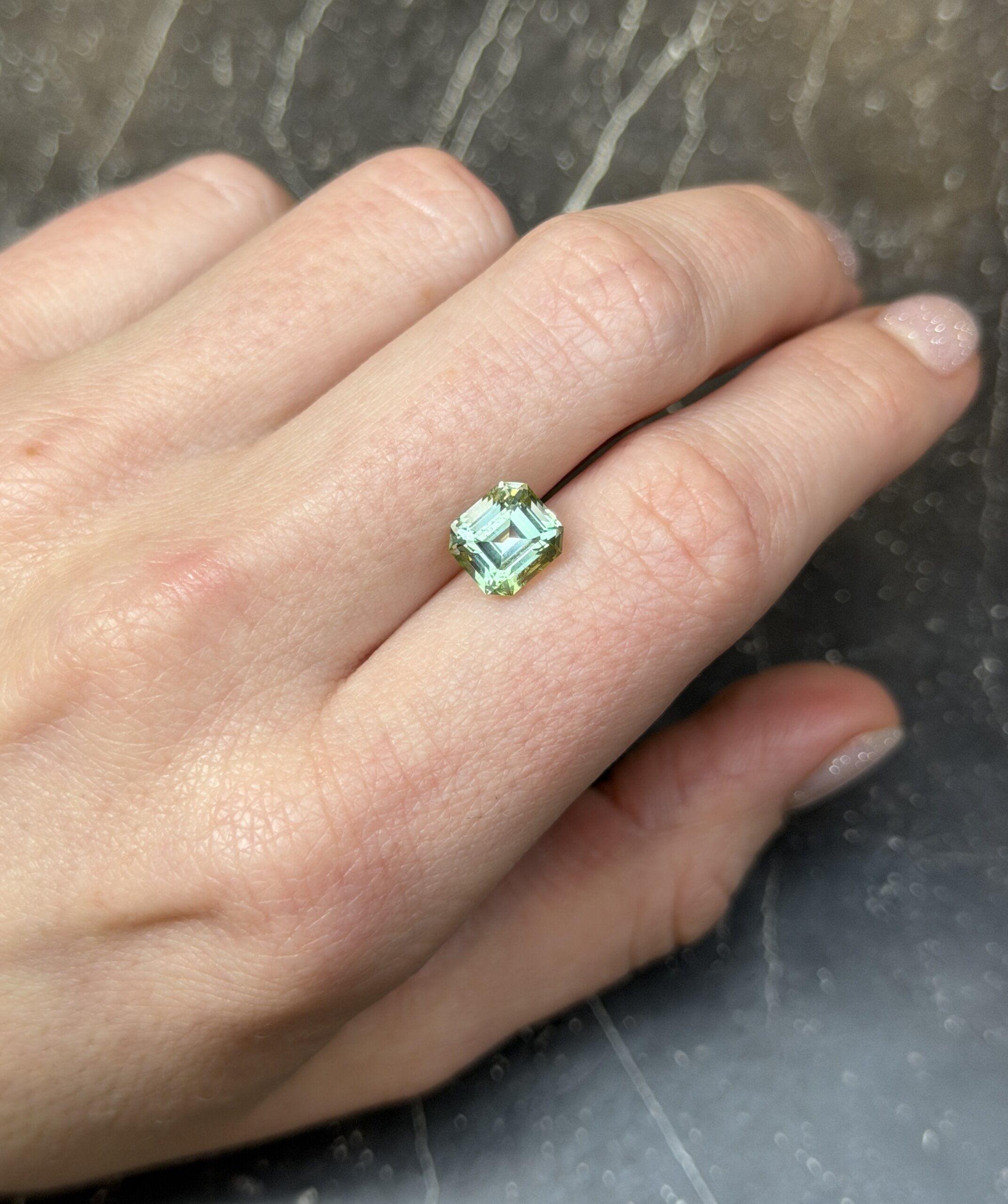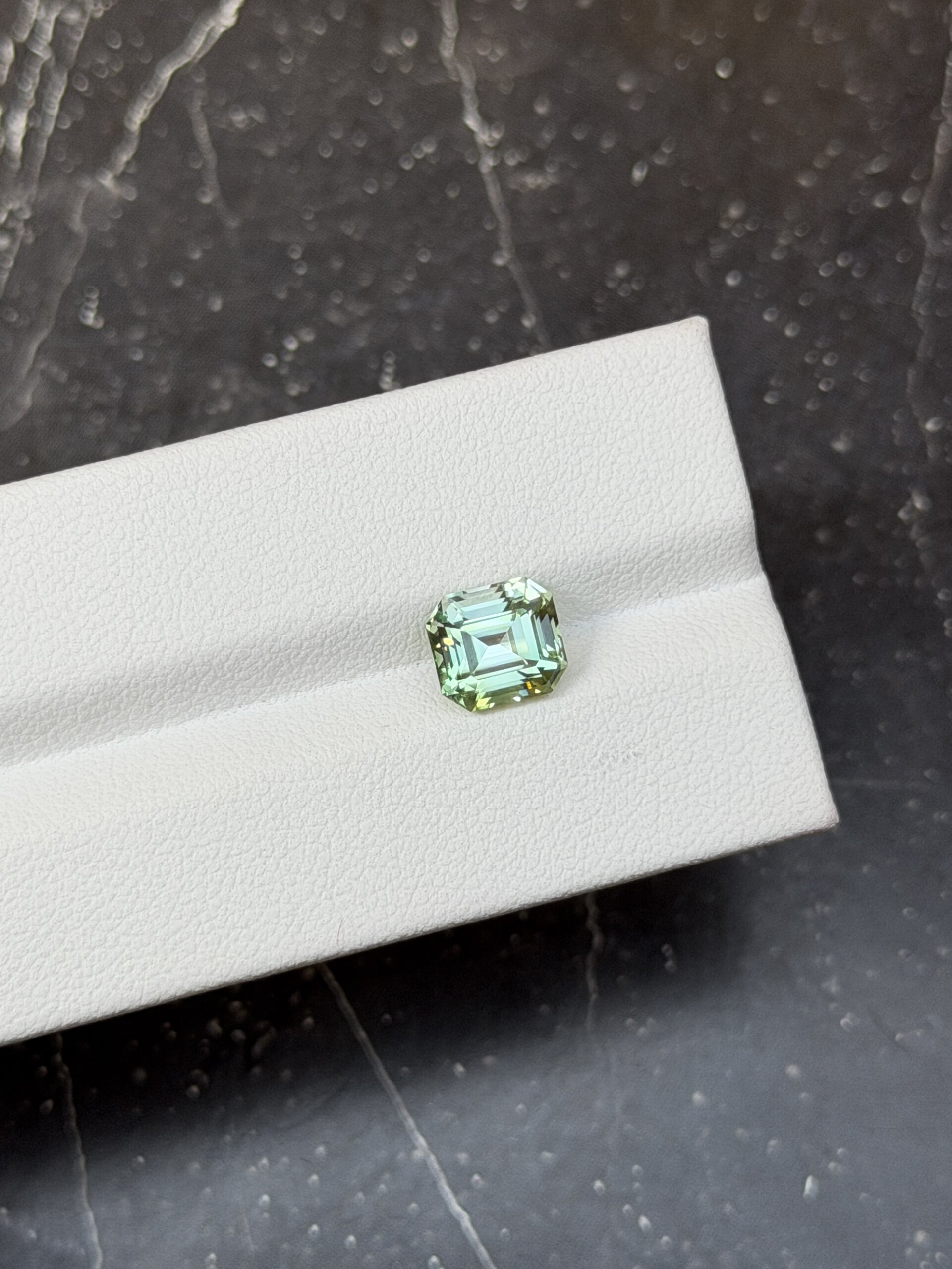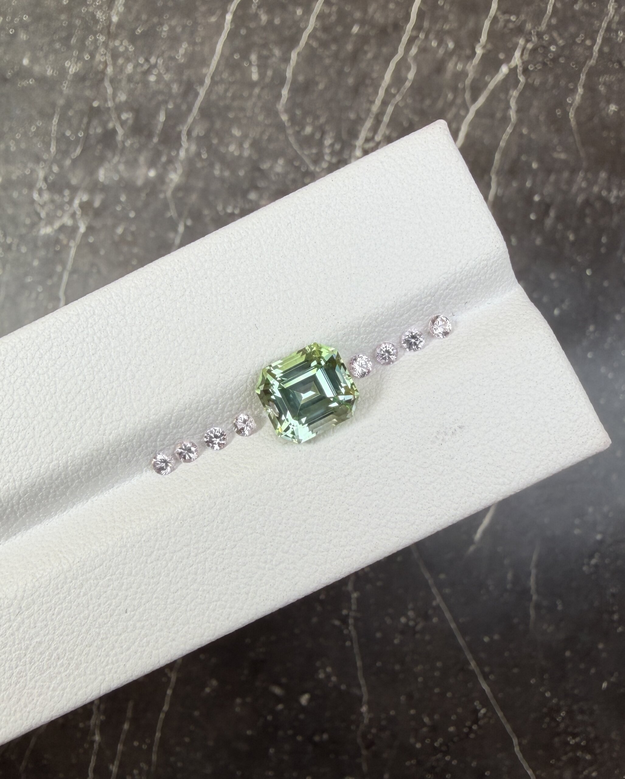 Турмалин в огранке октагон нежного мятного оттенка. Рекомендуем сочетать данный камень с розовой шпинелью.